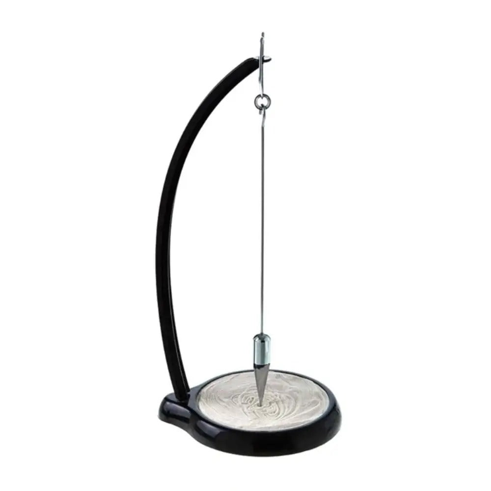 Ein handgefertigtes Pendel, das die unsichtbare Kraft der Schwerkraft in sichtbare Linien übersetzt. Mit jeder Bewegung entsteht ein neues Muster – flüchtig, präzise, niemals identisch. Der Sand fällt, die Zeit wird sichtbar, der Raum wird still.
